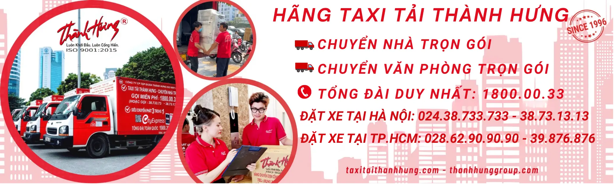 Taxi Tải Thành Hưng từ năm 1996 là đơn vị tiên phong trong lĩnh vực dịch vụ xe tải, chuyển nhà, chuyển văn phòng trọn gói tại Việt Nam.Với 30 năm kinh nghiệm, đội ngũ chuyên nghiệp và quy trình làm việc chuẩn hoá.