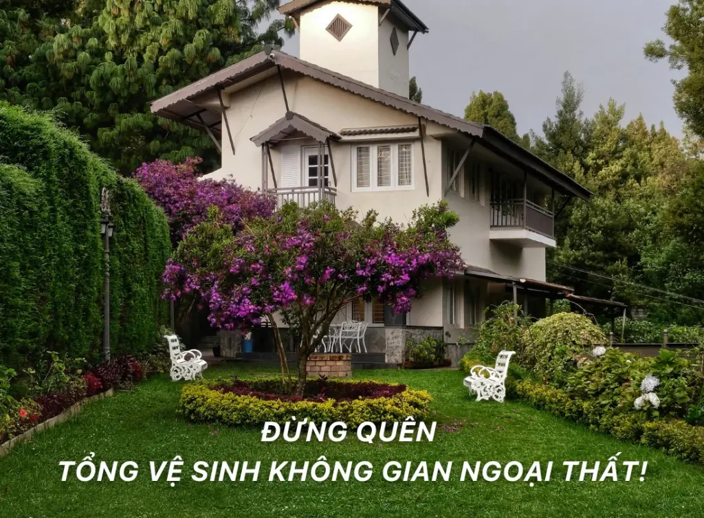 Không gian ngoại thất: Nếu nhà bạn có sân vườn, ban công hoặc không gian ngoại thất khác thì đừng quên tổng vệ sinh toàn diện để tận hưởng không gian sống sạch sẽ.